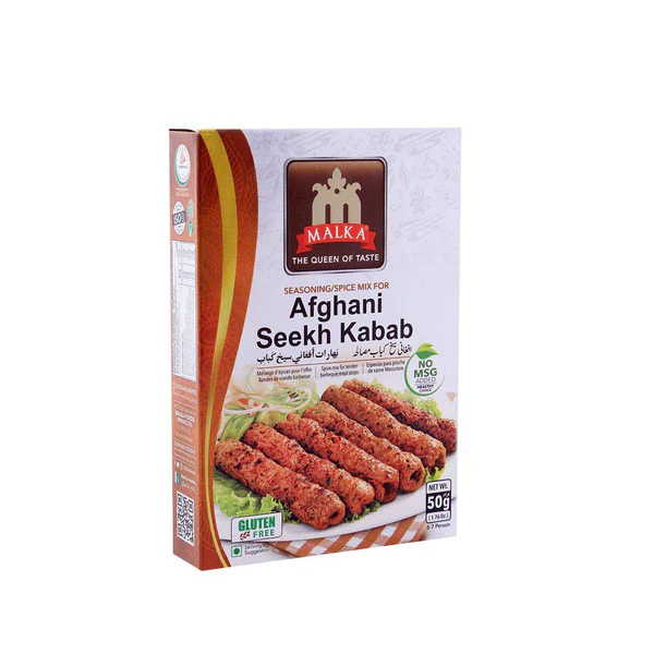 Enjoy the rich, smoky taste of authentic Afghan-style kababs with Malka Afghani Seekh Kabab 50g x 12. Expertly blended with coriander, cumin, red chili, garlic, ginger, black pepper, and aromatic herbs, this spice mix gives your kababs a perfect balance of heat and flavor. Ideal for beef, chicken, or mutton, it ensures juicy, flavorful seekh kababs every time — just marinate, grill, and savor the taste.